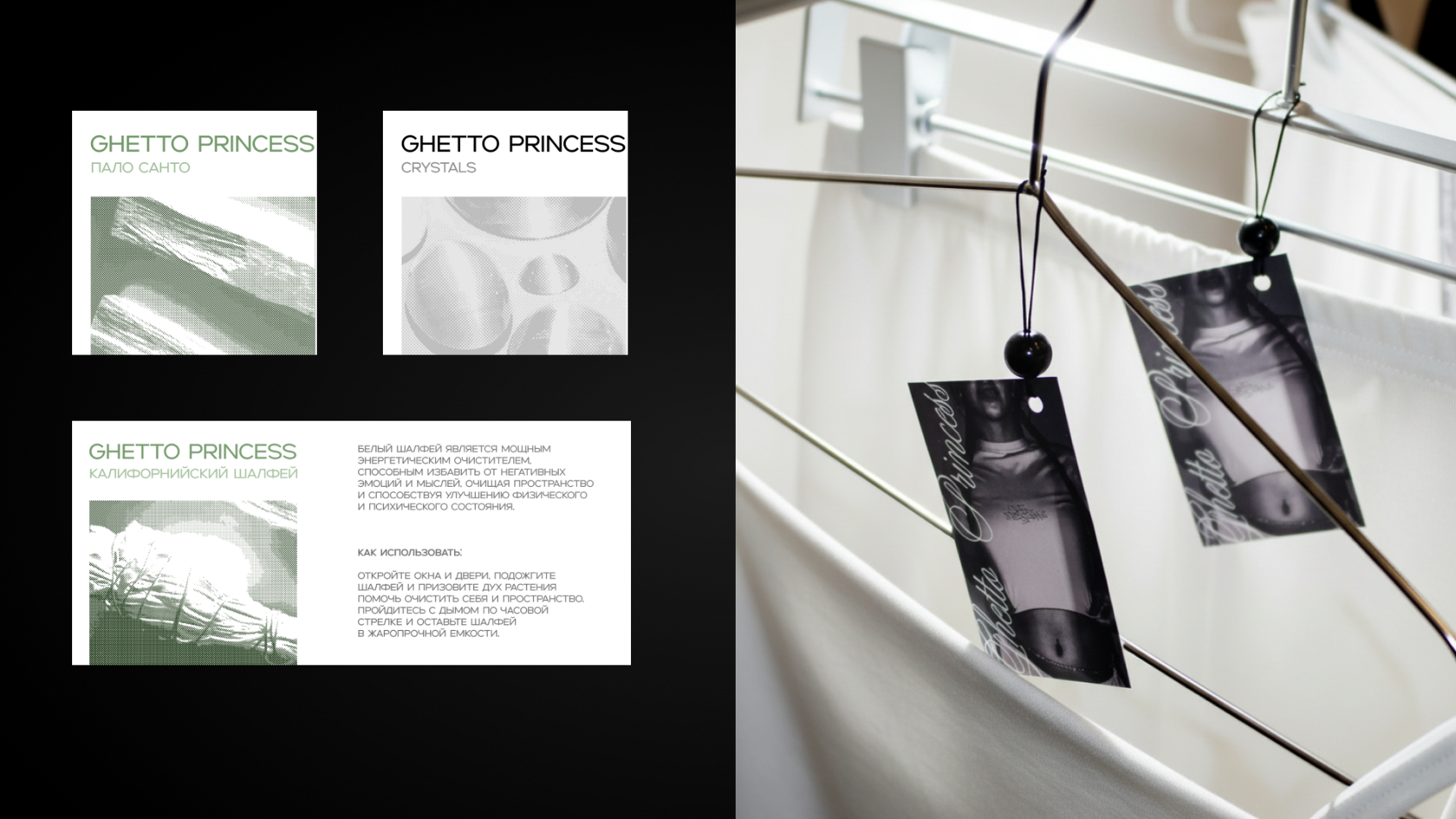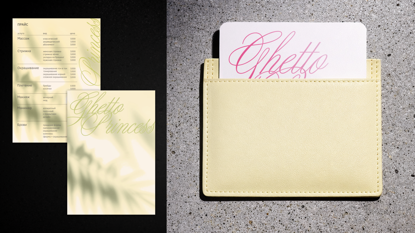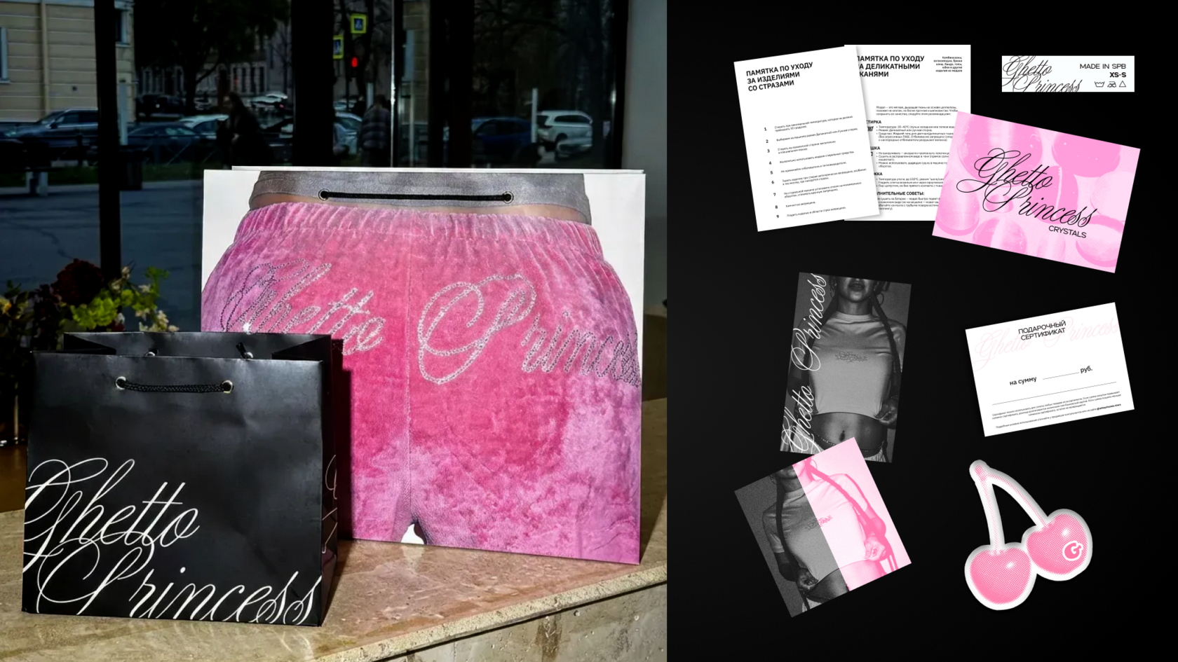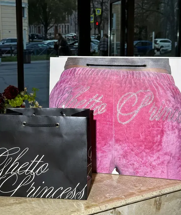 Разработать обновлённый фирменный стиль для бренда Ghetto Princess с сохранением узнаваемых элементов (в том числе логотипа) и создать единую визуальную систему для пространства, объединяющего магазин одежды, шоу-рум и салон красоты.